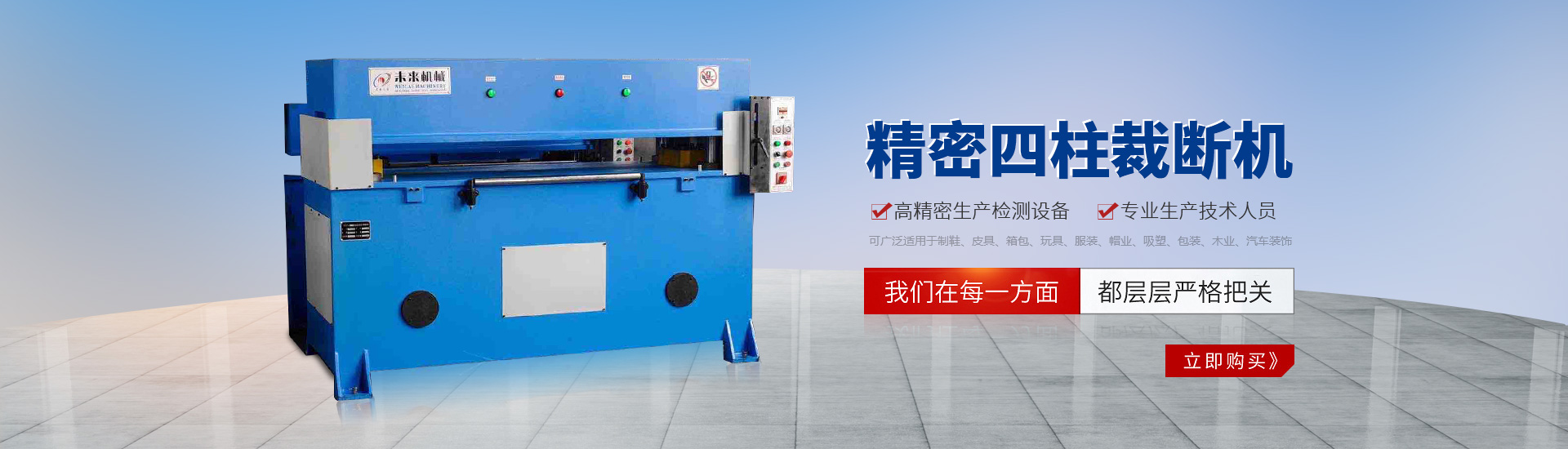 公司專業(yè)制造l 2T一25T液壓搖臂式裁斷機(jī):25T一30T液壓平面式裁斷機(jī);25T一30T液壓四柱龍門移動式裁斷機(jī);25T一100T液壓四柱平面式裁斷機(jī):30T一100T精密四柱式裁斷機(jī)(自動進(jìn)料);100T一200T液壓四柱下壓式裁斷機(jī)(自動進(jìn)料)和客戶要求的特型裁斷機(jī)械系列。產(chǎn)品規(guī)格齊全,可廣泛適用于制鞋、皮具、箱包、玩具、服裝、帽業(yè)、吸塑、包裝、木業(yè)、汽車裝飾等行業(yè)。